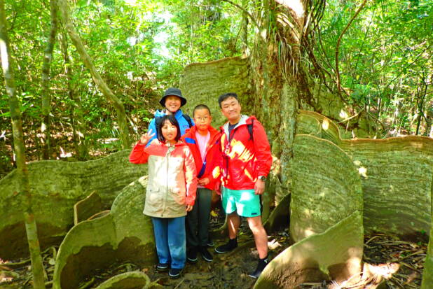 上陸後に寄り道したサキシマスオウノキの根っこに圧倒されてました(笑)