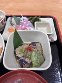 焼きナスとピーマンの味噌ダレ和えです。