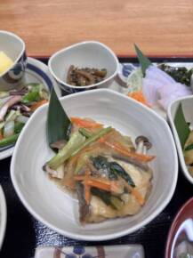 揚げた魚に野菜の入った出汁に付けて煮込んでいます。